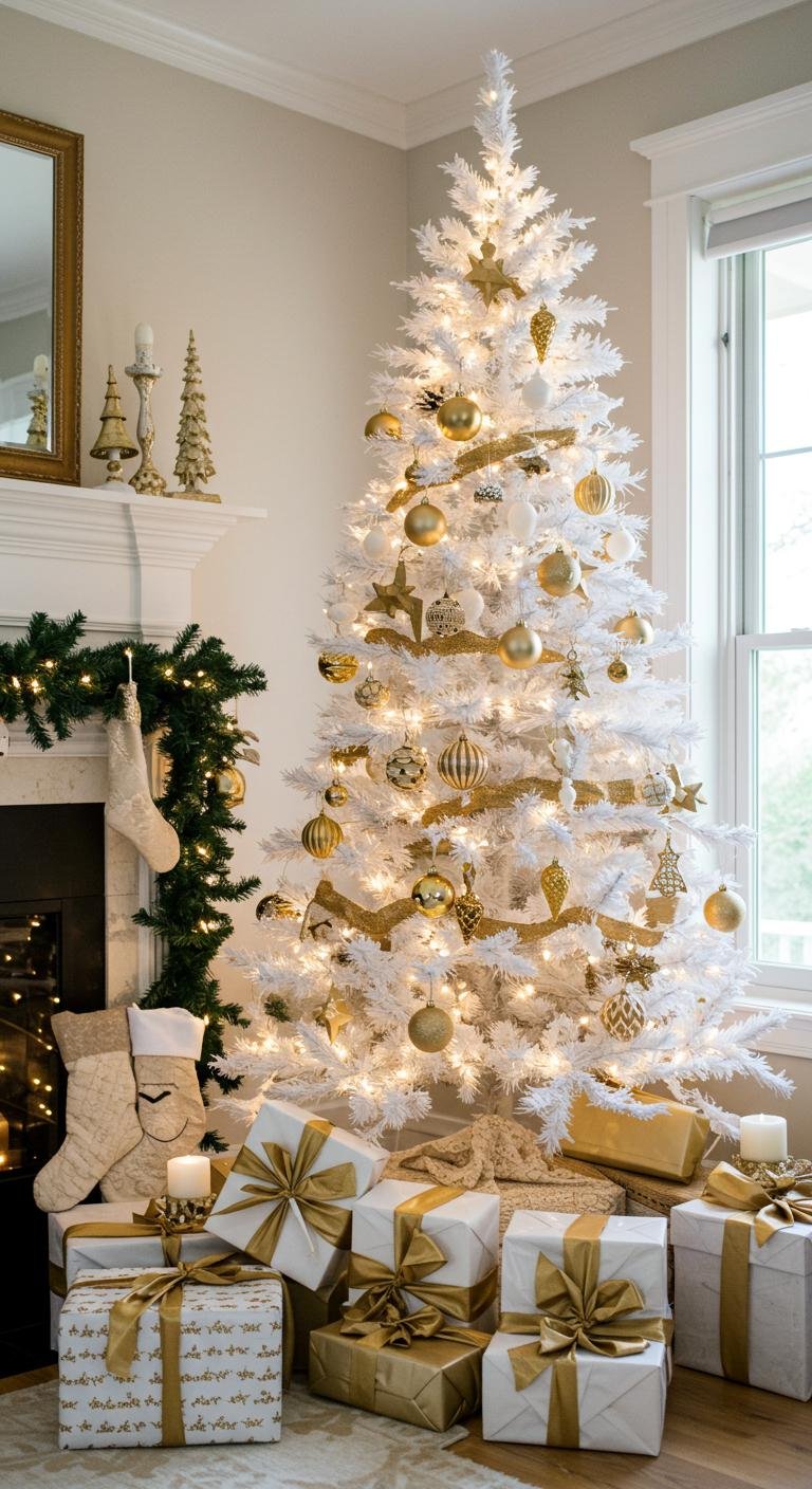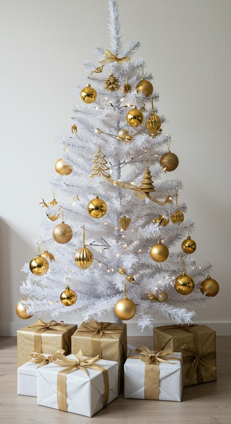 Sometimes less really is more. A minimalistic tree with just a handful of standout gold ornaments lets the white tree’s beauty shine right through. It feels calm, elegant, and makes a strong statement without needing a ton of decorations. Plus, it’s budget-friendly and great if you like to upcycle old ornaments into sleek new favorites.
