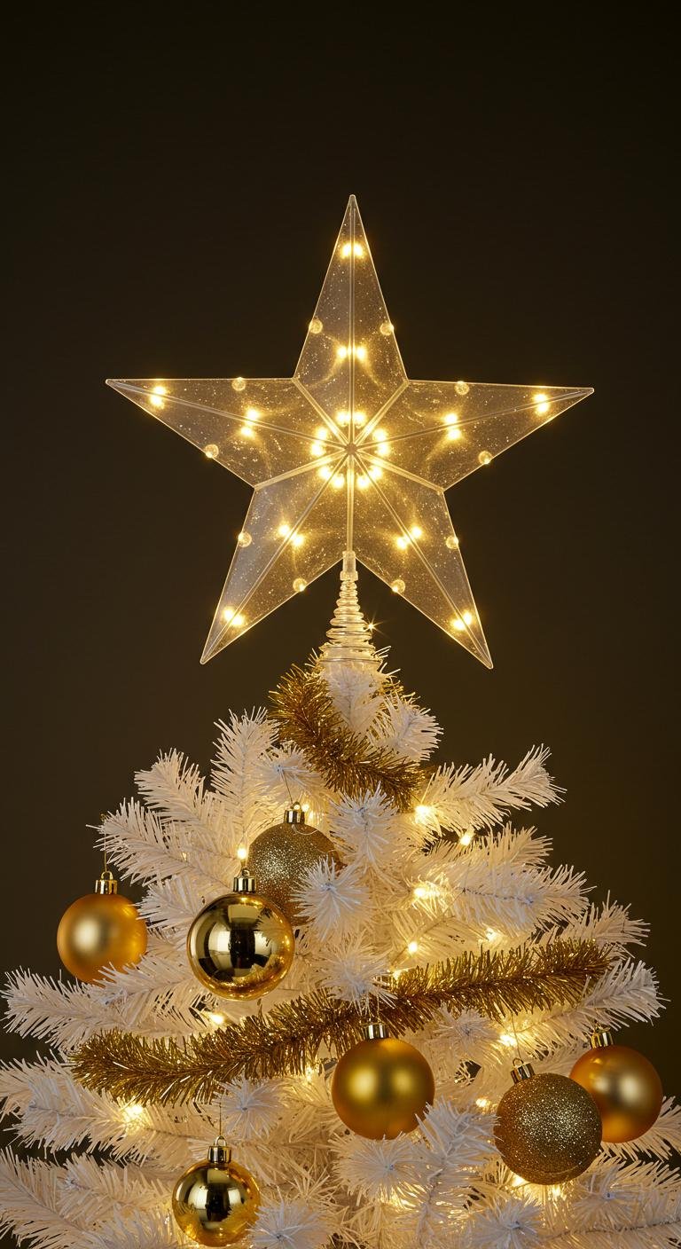 A striking tree topper truly crowns your masterpiece. Light-up stars or angels that blend with your white and gold palette are always winners. If you’re on a budget, get creative: transform a simple ornament with a decorative base or add sprigs of greenery for a custom look. It’s this personal touch that makes your tree feel extra special and memorable.