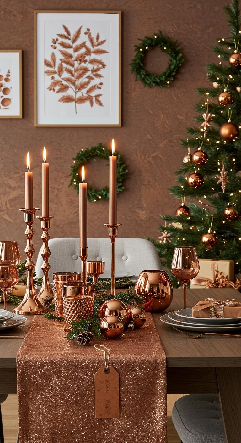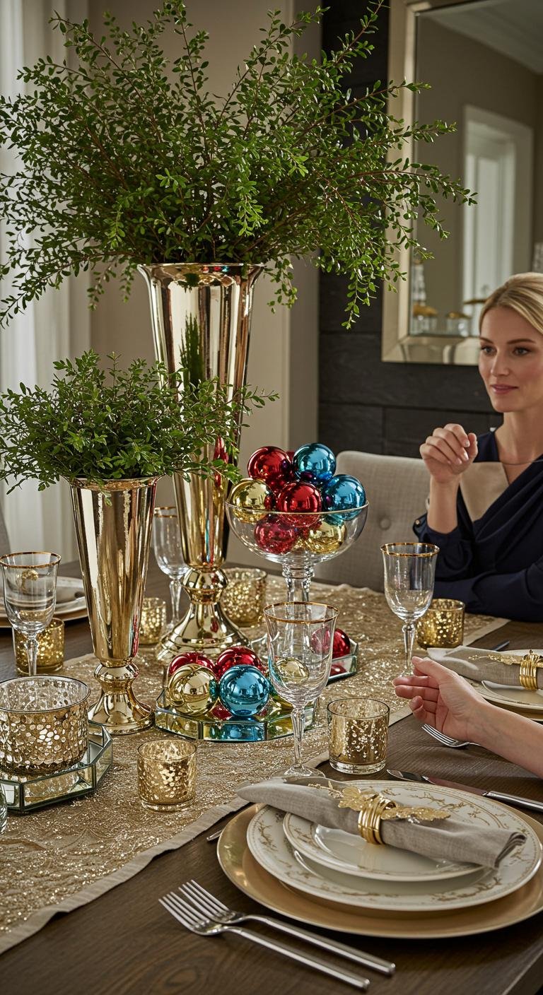 Pair metallic table runners with shimmering glassware to catch the light beautifully. Consider using mirrored trays filled with ornaments or metallic vases overflowing with seasonal greenery.