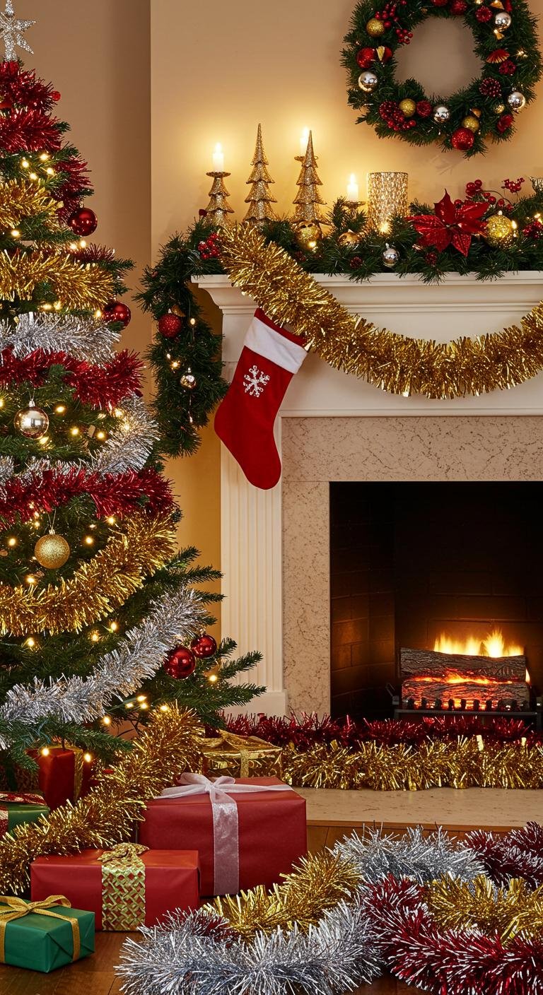 Choose vibrant tinsel garland colors like gold, silver, or holiday red to create a striking display.