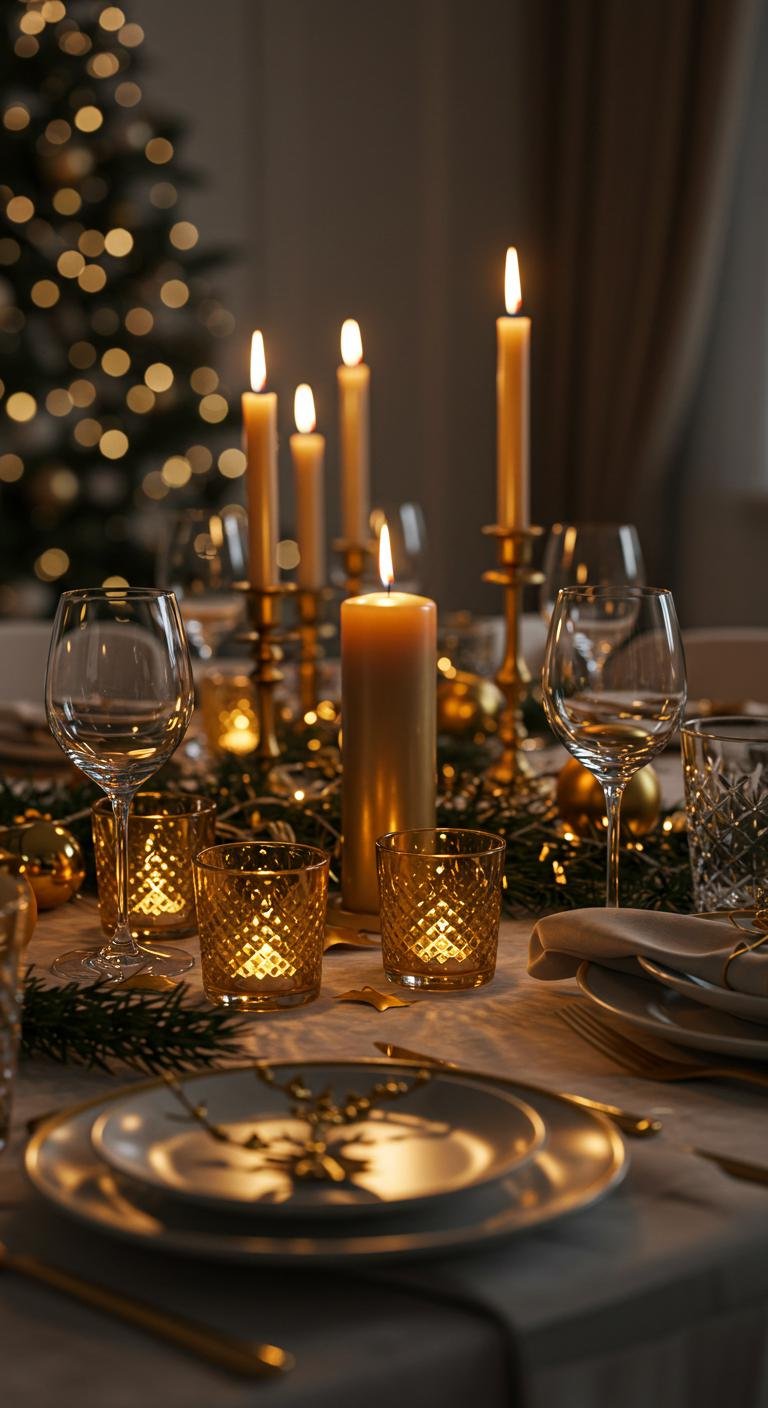 Nothing transforms a space quite like golden candles, which not only provide a warm glow but also infuse your festive gathering with an inviting ambiance.