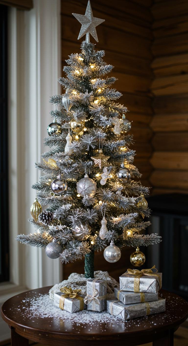 Shifting from the cozy, rustic charm of a cabin space, an Elegant Silver and Gold Mini Tree introduces a touch of sophistication that elevates your holiday décor.