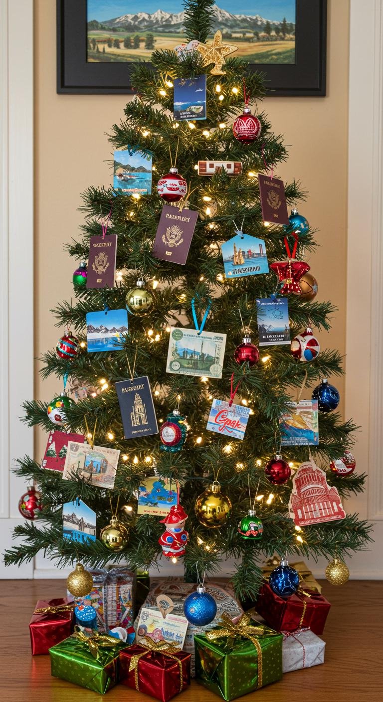 Adorned with holiday souvenirs and cultural ornaments, it captures travel memories from various destinations. Incorporate passport decorations and scenic landscapes, showcasing world landmarks and global traditions.
