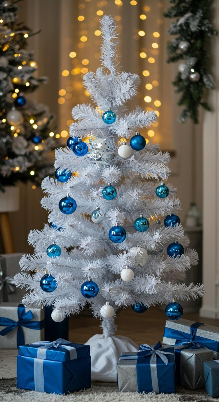 Embrace color harmony by combining blue ornaments and white accents, creating a stunning focal point.