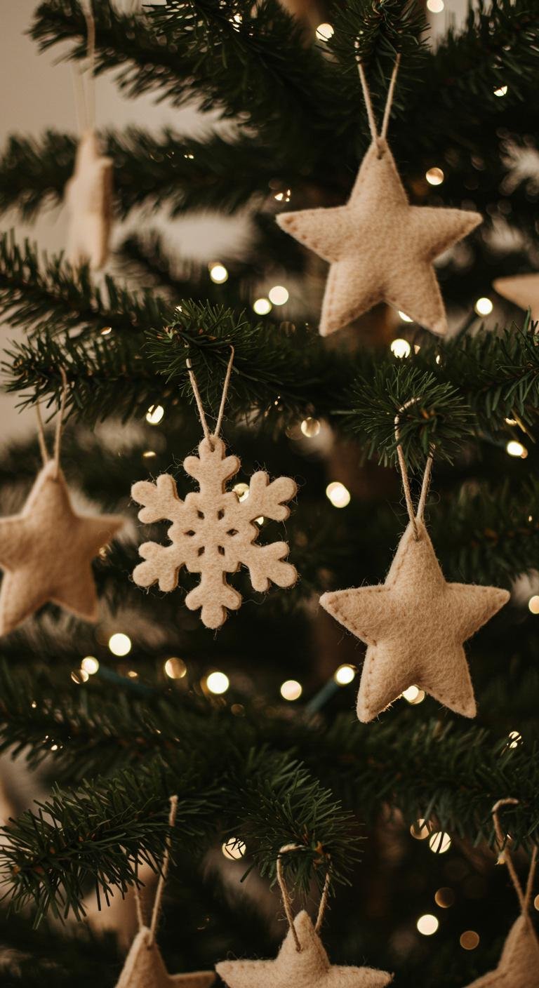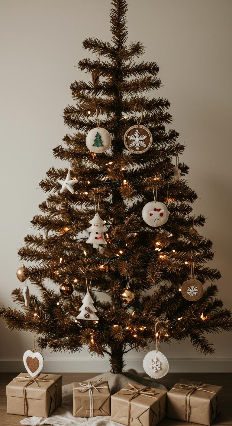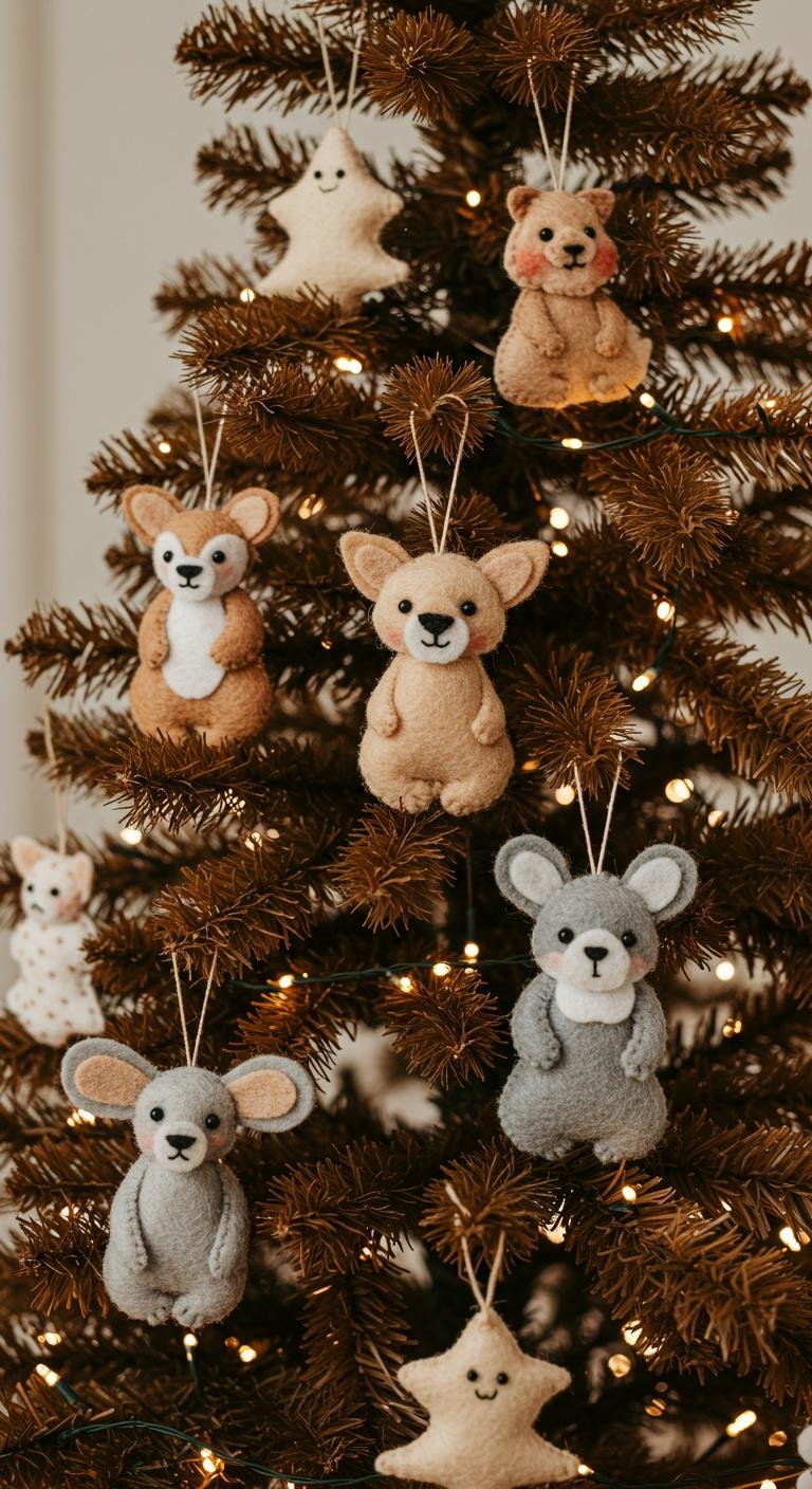 Felt decorations bring that gentle, soft texture that pairs amazingly with earthy browns. Plus, making them yourself is pretty fun—cut the felt into playful shapes like stars or snowflakes, add a bit of stitching or glue for detail, and you have charming handmade ornaments. White or cream felt works beautifully here, giving a nice contrast without being too loud. Also, felt is super affordable and comes in all sorts of colors if you want to mix it up a bit.