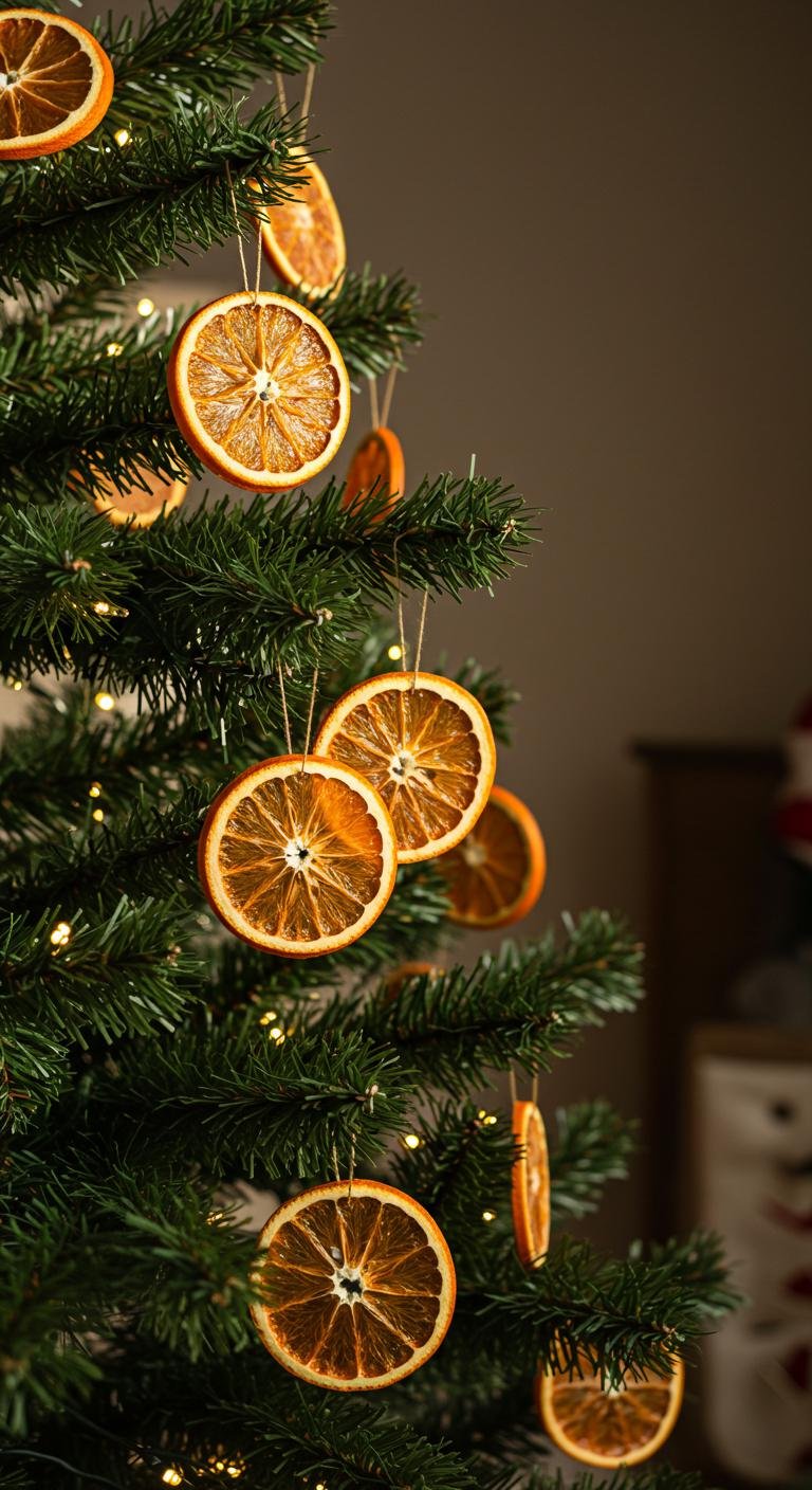 Brightening things up a bit, dried orange slices are such a darling natural detail. They add a fresh dash of color without breaking the neutral theme and come with the bonus of a lovely citrusy scent that fills the room. Making them yourself is super easy — just thinly slice oranges and dry them low and slow in the oven. Then, string them with twine or simply hang them on the branches. Toss in some white or beige accents alongside, and the whole look feels effortlessly cohesive and fresh.