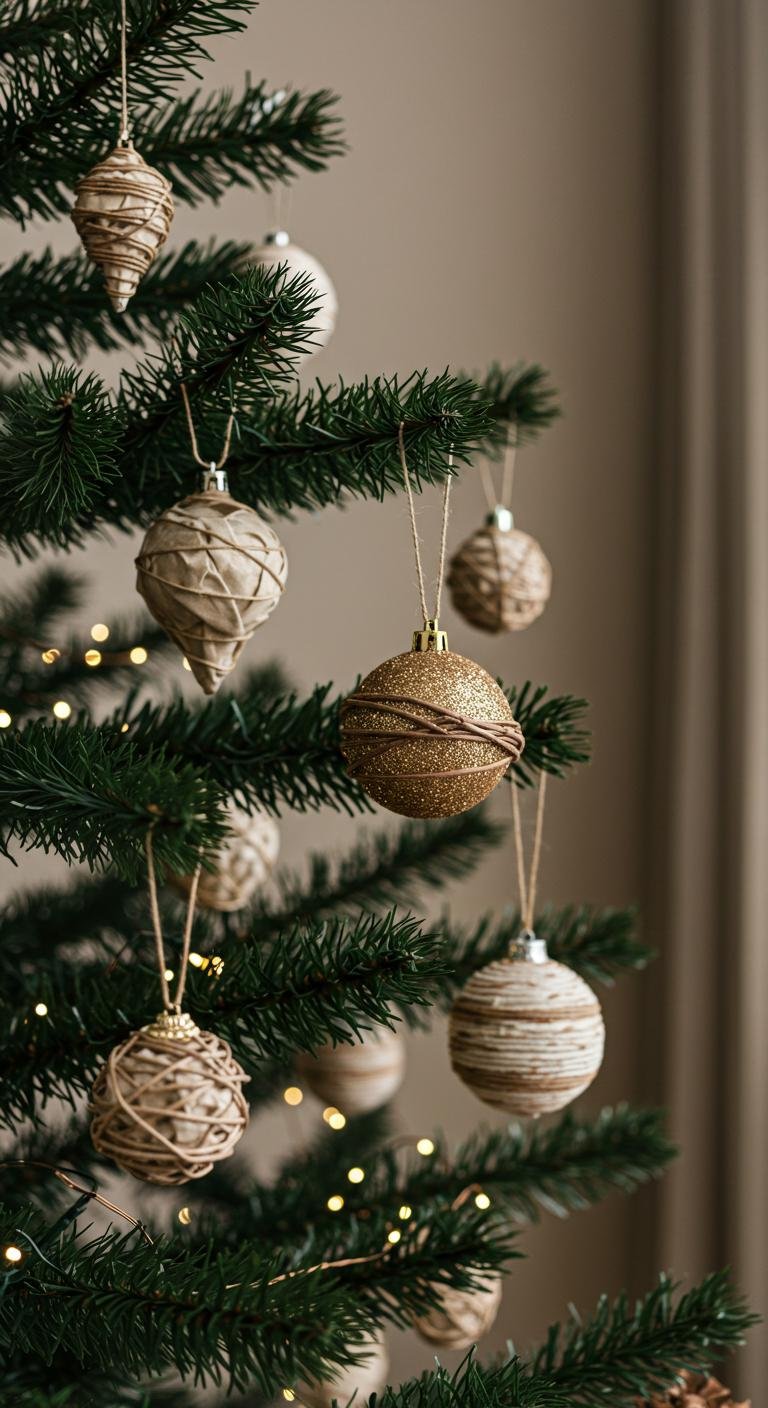 There’s something so soothing about sticking to one color for your ornaments, especially when that color blends seamlessly with your neutral palette. Soft gold or silvery white totally nails that serene, elegant vibe. Mix up the shapes and sizes to keep things interesting — too much uniformity can get boring. Another fun idea? DIY pine cone or wooden ornaments painted in your chosen shade. Hanging them at different heights adds a balanced and thoughtfully layered look that’s both simple and captivating.
