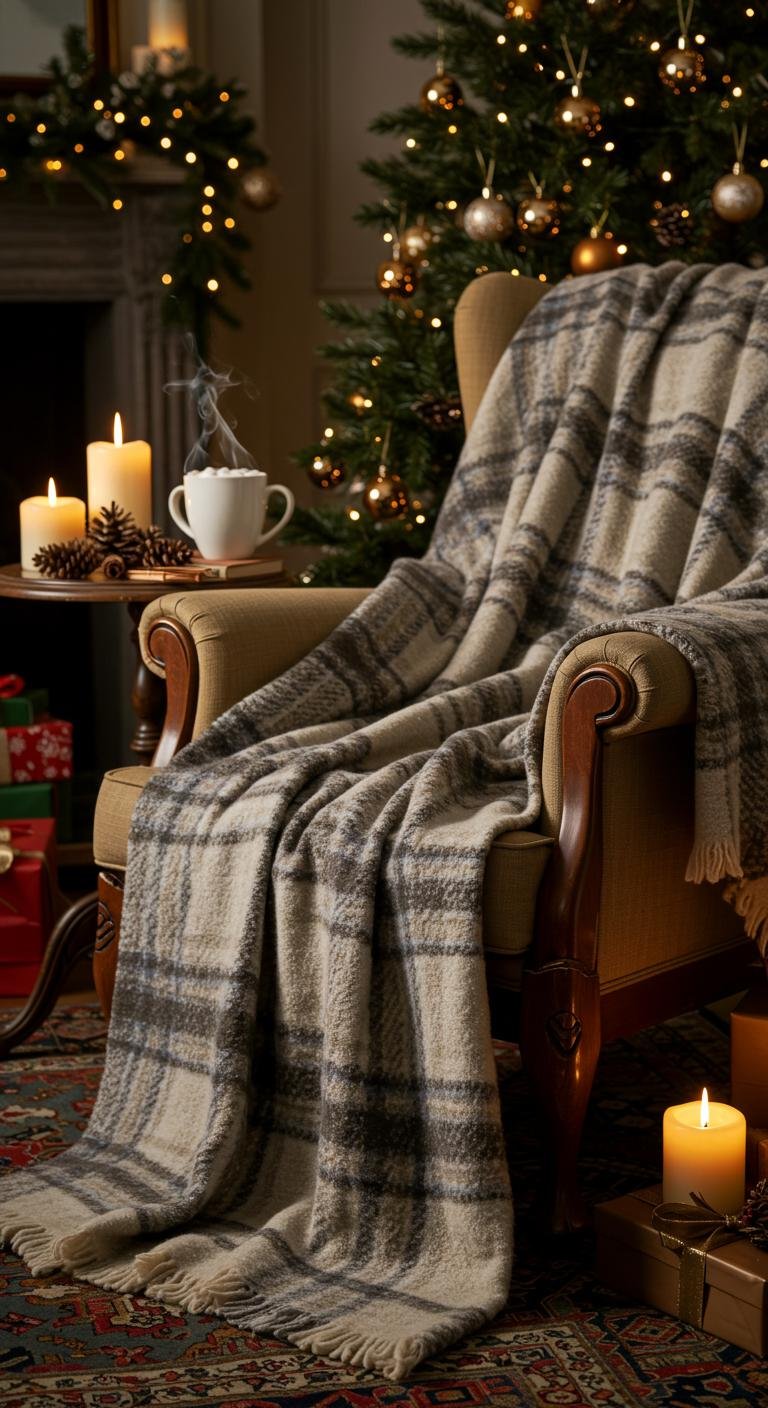 Plaid and tartan textiles are like the signature scent of farmhouse Christmas. Bring them in through cushions, throws, or table runners in classic reds, greens, or muted tones that blend perfectly with your space. Mixing different plaid patterns adds depth without feeling chaotic. If you’re shopping on a budget, look for deals after the holidays or hit discount stores. These textiles not only look warm and inviting but actually make your space feel warmer, which is perfect when everyone’s gathered for the festivities.