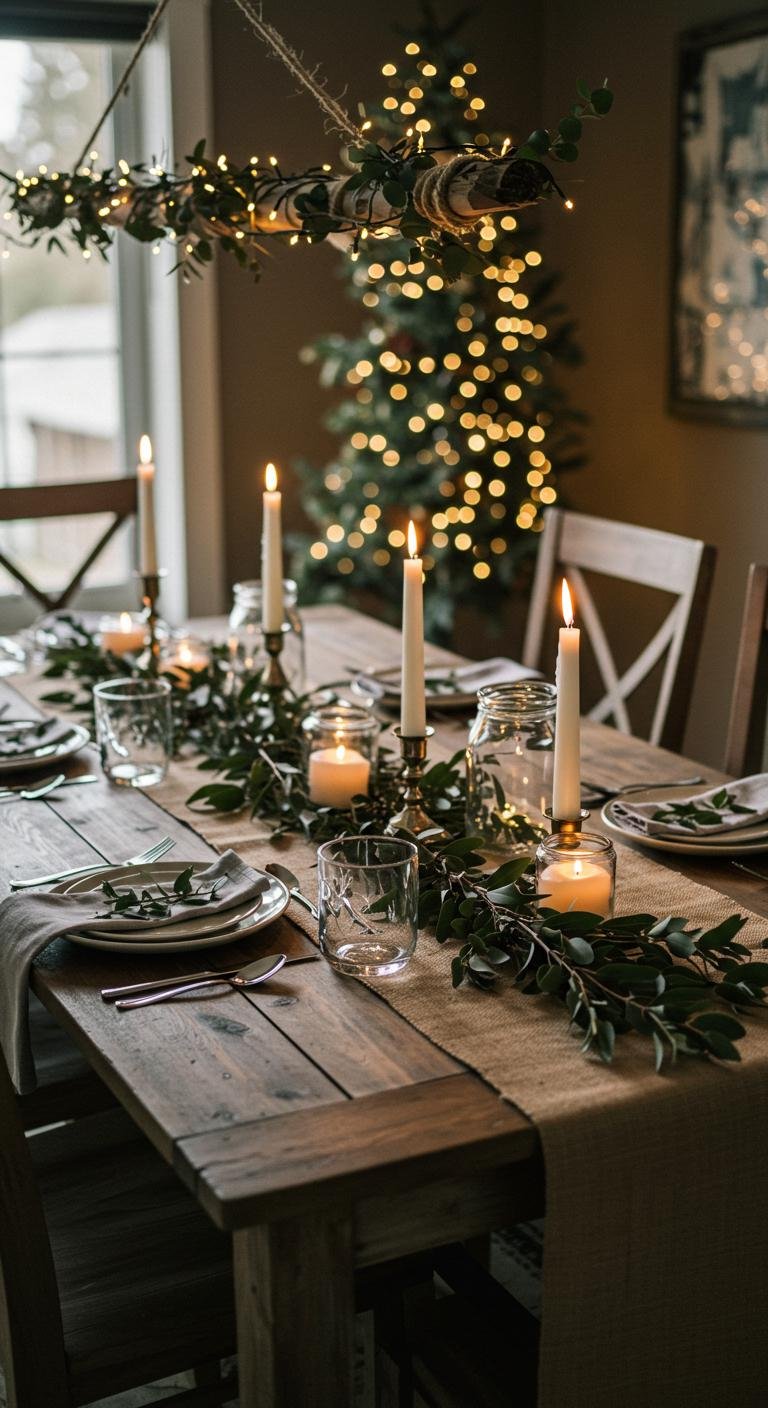 The holiday table is more than just a place to eat—it’s where memories happen. Use a burlap runner as the base and layer on eucalyptus or pine sprigs for a simple, natural centerpiece. Clean white dishes paired with napkins in soft, muted hues keep things timeless, while wooden chargers or rustic placemats bring in that farmhouse feel. For an affordable tip, forage your local green spaces for fresh greenery to make centerpieces. Add candles of varying heights for a warm glow that sets the perfect vibe for holiday dinners and long chats.