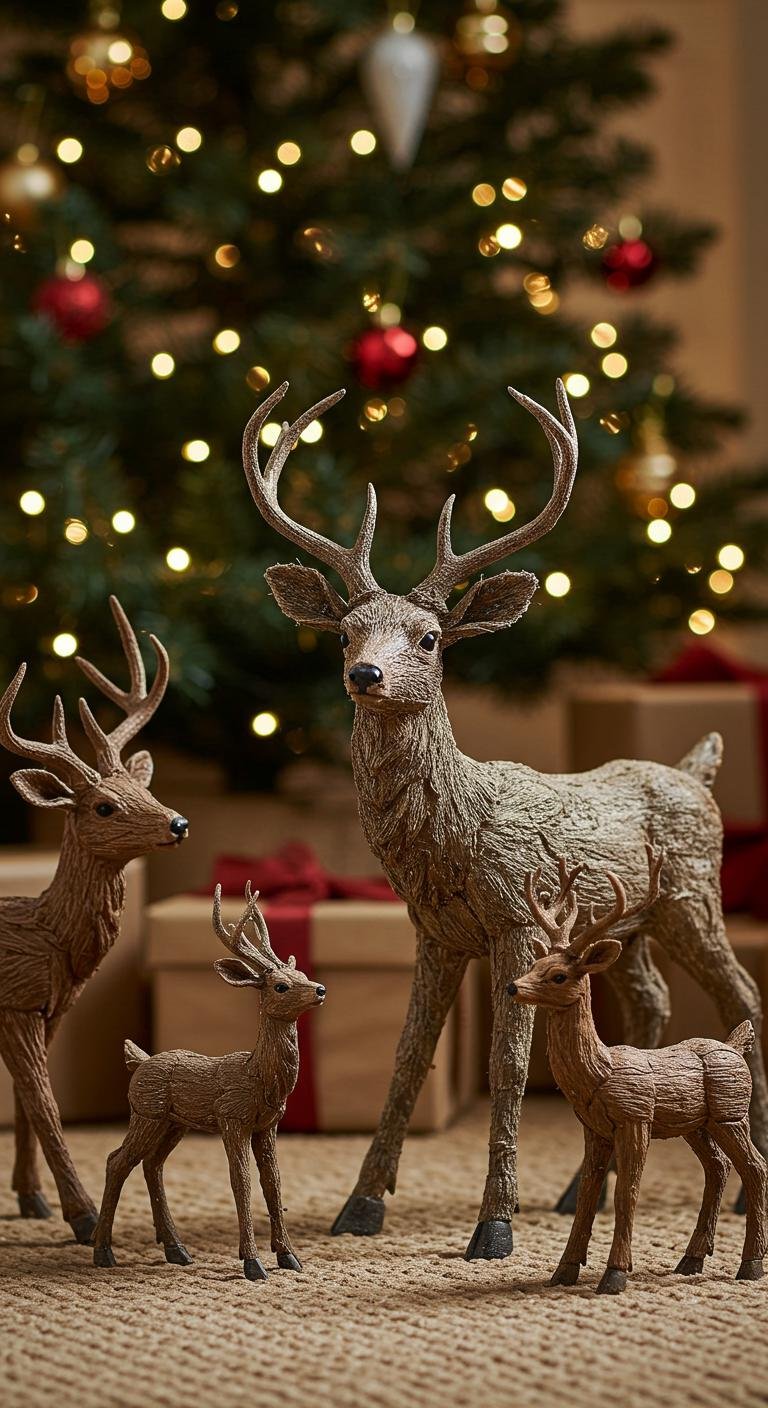 Rustic deer figurines are like little bursts of woodland magic for your shelves and mantels. You can find these in stores or online, often crafted from wood, or if you’re feeling artsy, grab a DIY kit and paint your own with soft metallic tones for a sleek farmhouse-modern twist. Grouping different sizes together creates a dynamic, playful vibe, especially nestled among greenery or soft twinkling lights.