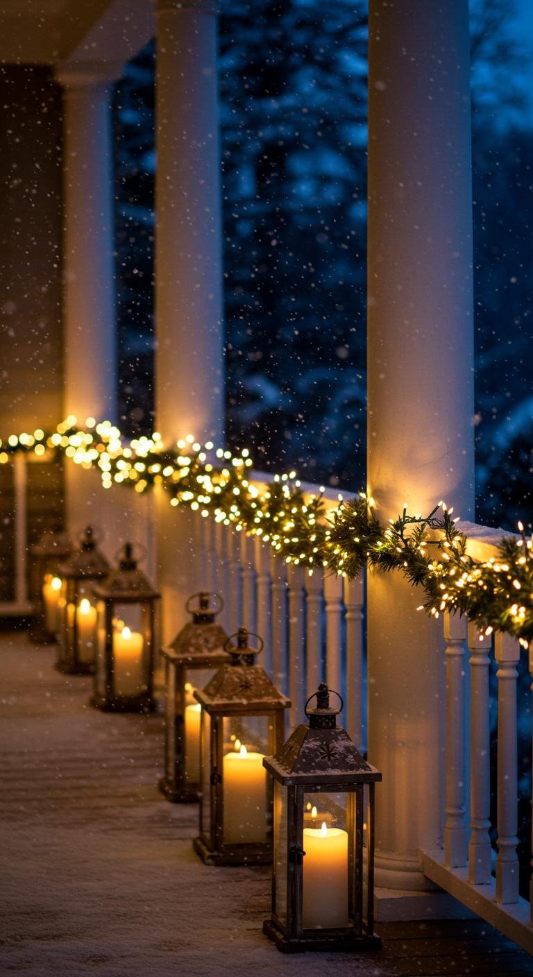 Twinkling lights honestly have this way of turning any porch into a winter wonderland. Warm white lights give that classy vibe, while multi-colored bulbs stir up some nostalgic feels. Want to save a few bucks? Best time to snag lights is after the holidays during sales. Wrap them around your railings, trees, or shrubs to get that soft glow going. For smaller spots, battery-operated lights are lifesavers, and adding lanterns with candles or solar lights makes nights downright enchanting.