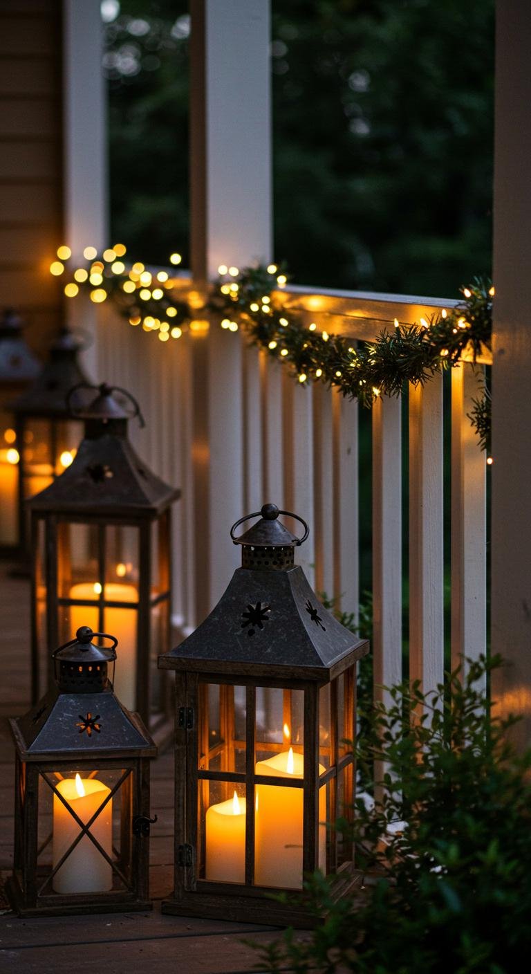 Lanterns instantly add warmth and coziness. I love rustic styles for that classic feel, especially when you arrange them at different heights. Fill them with candles or fairy lights — battery-operated ones are great for safety and ease. Check discount stores or online for affordable options, and decorate inside with pine sprigs or ornaments to amp up the holiday charm.