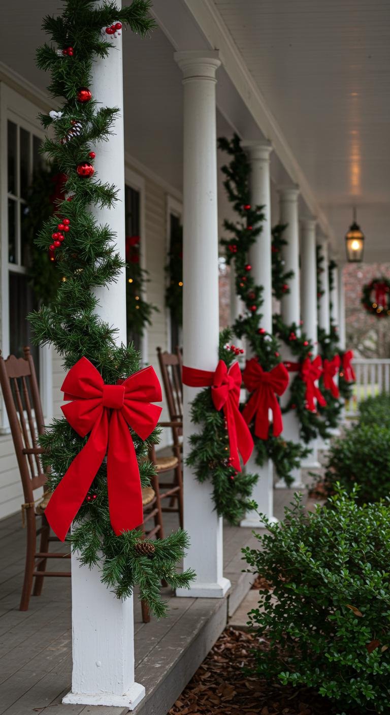 Bows are such an easy way to bring a joyful pop to your porch. Slap on big bows to posts or hang them from fixtures for a sweet, festive detail. Making your own is simple using patterned ribbons and a basic knot. Pairing bows with greenery like eucalyptus or pine really steps up the elegance. Heads up—ribbons go on sale after the holidays, so stock up!
