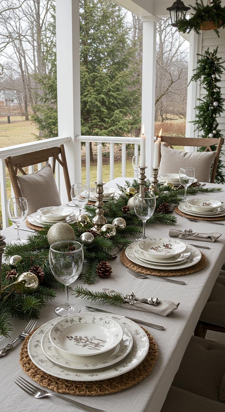 A festive table on your porch can be a real attention-grabber. Keep the setup simple but elegant with seasonal touches like pine sprigs and candles. Dollar stores are lifesavers for budget-friendly dishes and decor. Fresh flowers or holiday figurines add personality, making it a welcoming spot that invites good times and gatherings.