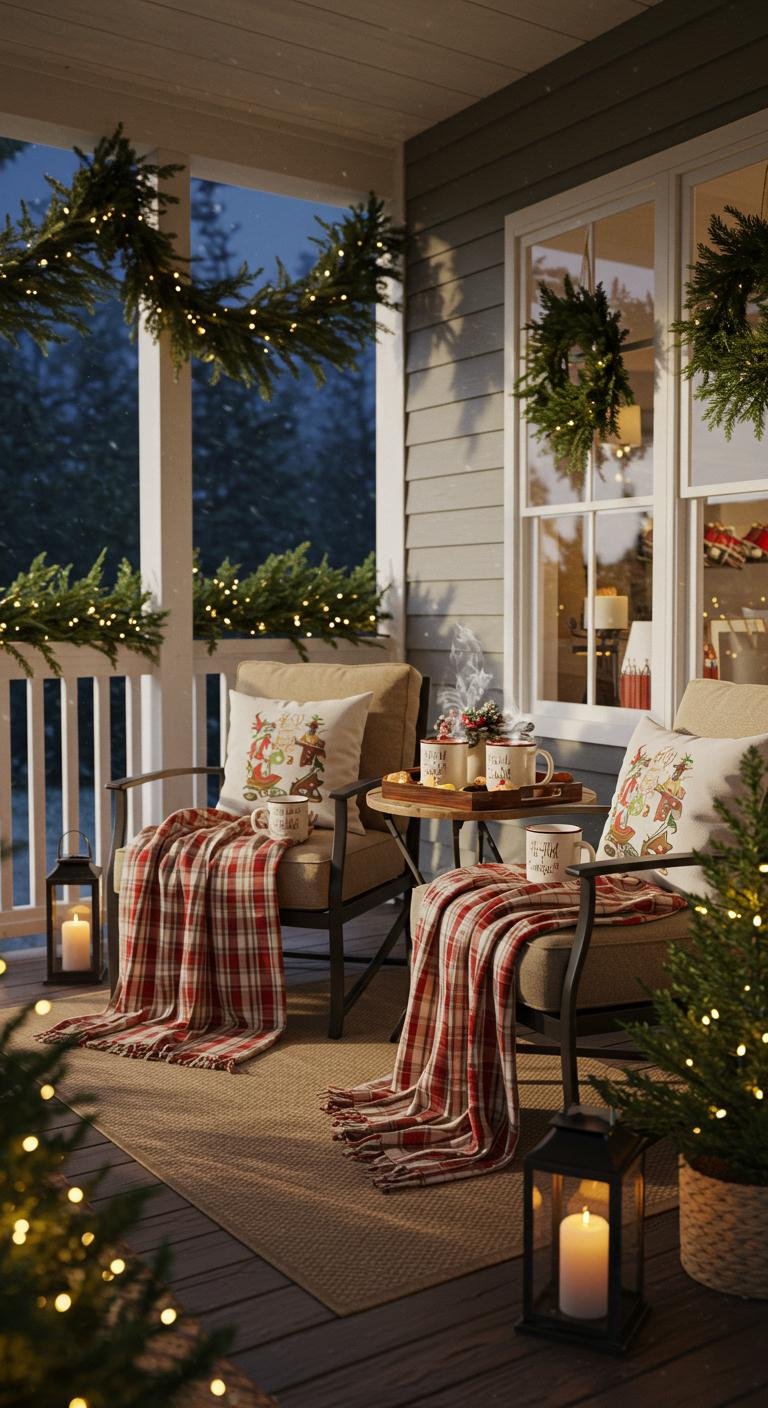 A welcoming porch needs a comfy spot to sit, right? Layer on outdoor cushions and warm blankets in holiday shades — perfect for curling up during chilly evenings. Little tables for drinks or snacks are ideal, and finishing touches like holiday-themed mugs make it all the more festive. Thrift stores often have unique and affordable pieces to help you customize your corner.