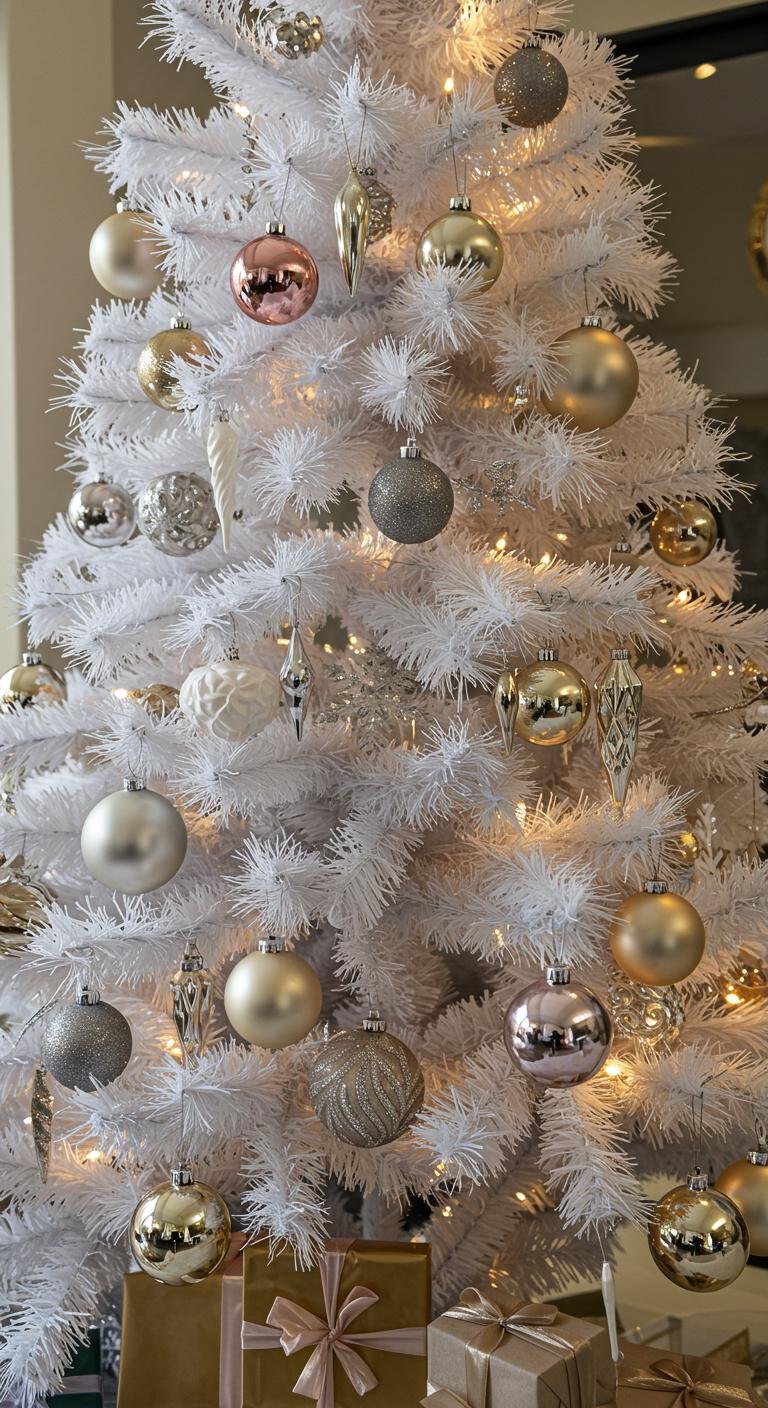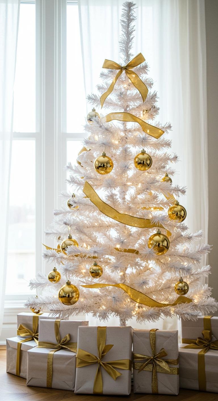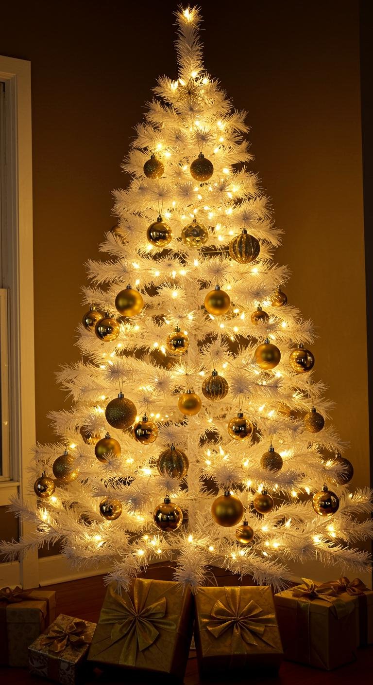 Lighting can totally make or break your holiday mood, right? On a white tree, golden lights feel like warm hugs all around. Wrapping those warm white string lights snugly over your branches adds instant coziness. But here’s the fun part—throw in some multicolored lights for a pop of playful contrast that makes the whole scene inviting and festive. LED lights are affordable and flexible, so you can switch it up any year without fuss. Pair those twinkling lights with shiny gold ornaments, and bam—you’ve got real holiday magic happening.