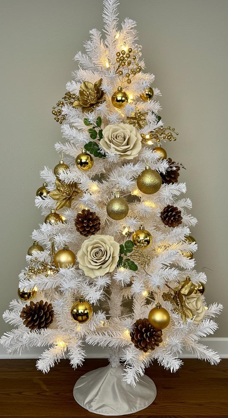 Adding nature-inspired elements like pinecones and faux floral accents in gold or white is an easy way to warm up your tree’s look. Bonus: if you’re feeling thrifty, those pinecones can come straight from your neighborhood walk! Just spray paint a few gold ones, mix in white blooms, and tuck them into the branches. This combo makes your tree feel rustic yet elegant, which is a cozy vibe we all crave during chilly holiday months.