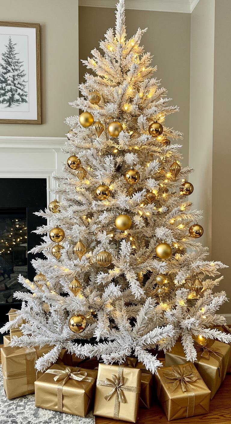 Sometimes less really is more. A small white tree with just a handful of carefully chosen gold ornaments and a single gold bow topping the whole deal? So sleek and modern. If you’re into that cozy winter wonderland vibe, flocked branches can do wonders without taking over the look. It’s all about balance—simple touches that feel intentional rather than cluttered. This minimalist approach can actually make your tree stand out in a room full of noise.