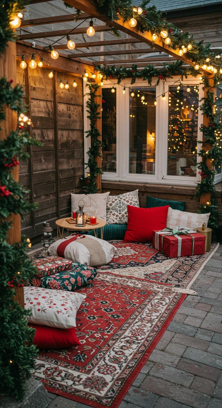 Who says textiles are just for indoors? Adding holiday-themed rugs and pillows outdoors creates a cozy scene perfect for chilly nights. There are lots of affordable options online and at discount stores if you don’t feel like sewing. If you want to DIY, making simple pillow covers with festive fabric is super satisfying. Even using your regular indoor rug for the season can transform the space into a comfy holiday hangout.