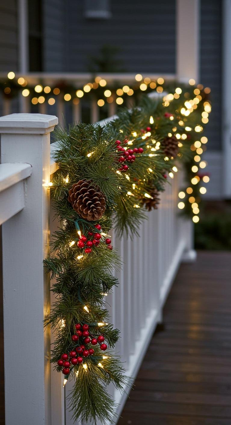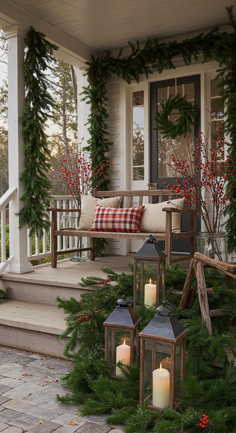 Nothing brings that cozy woodland feel like natural greenery accents. Pine garlands draped along the porch railing or wrapped around door frames instantly warm up the space. Bonus: you can go outside and gather pinecones and branches yourself to save a few bucks. Mixing in some faux greenery keeps things looking fresh all season. Add a strand or two of twinkling lights, or toss some greenery-filled baskets on your porch to really up the festive cozy factor.