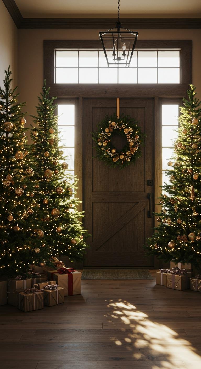 Want to make your entryway look effortlessly elegant? Symmetry is the secret. Placing matching trees or lanterns on either side of your door makes everything feel balanced and oh-so-classy. If you splurge on pre-lit trees, you’ll get a sleek look that’s easy to maintain. Keep decorations simple and coordinated for a clean finish that invites guests in with style.