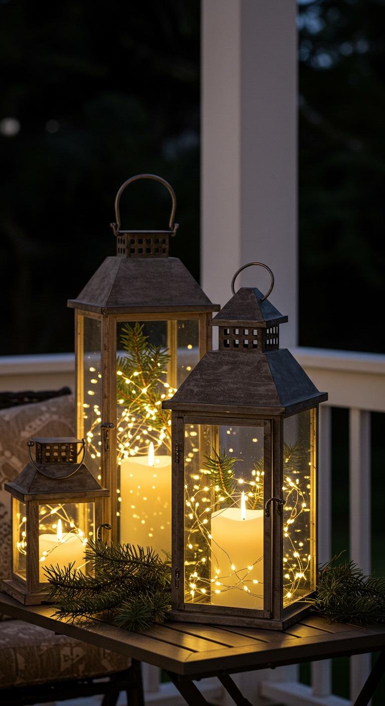 Lanterns are like magic makers for your outdoor mood. Whether you go rustic with weathered metal or glam with shiny metallics, filling them with fairy lights or flameless candles gives off the softest glow. Bonus points if you toss in some pine branches or berries inside the lantern for a festive touch. Don’t toss out your old lanterns — a fresh paint job can make them look brand new and ready to shine!