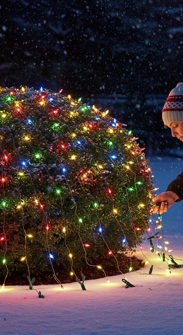 For bushes, try different bush lighting styles, such as net lights or simple string wraps, to add depth and dimension, making your yard the envy of the neighborhood!