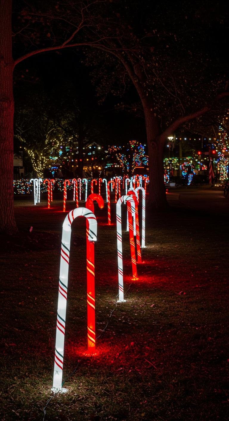 For ideal candy cane placement, lines along walkways or around trees not only guide guests but also enhance that magical, festive atmosphere everyone loves.