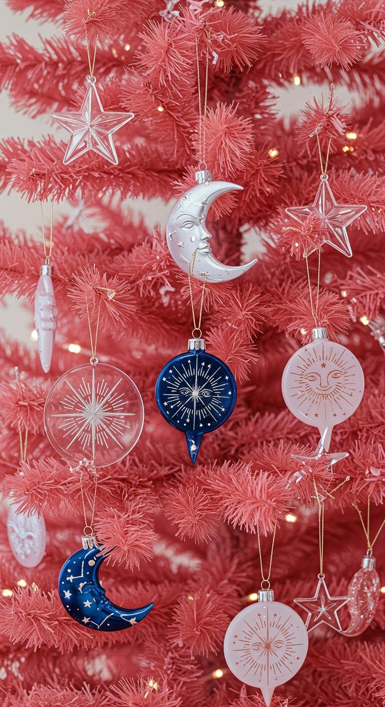Stars, moons, and planets—oh my! Celestial ornaments add a sprinkle of magic and fantasy to your pink tree. They’re easy to find or you can craft your own with metallic paints on cardstock. String them up with twine for that ethereal, out-of-this-world feel. These decorations turn your tree into a beautiful, starry night that sparks holiday wonder.