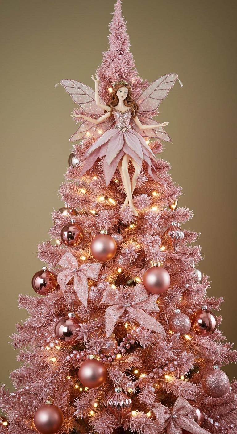 A fairy tree topper with sparkly wings or floral details is the perfect finishing touch for a pink tree. Whether you buy one or DIY with doll fairies, branches, or crafted stars, it adds whimsy and a focal point that draws the eye up. These toppers blend so well with pink ornaments and bring a storybook magic to your holiday atmosphere.