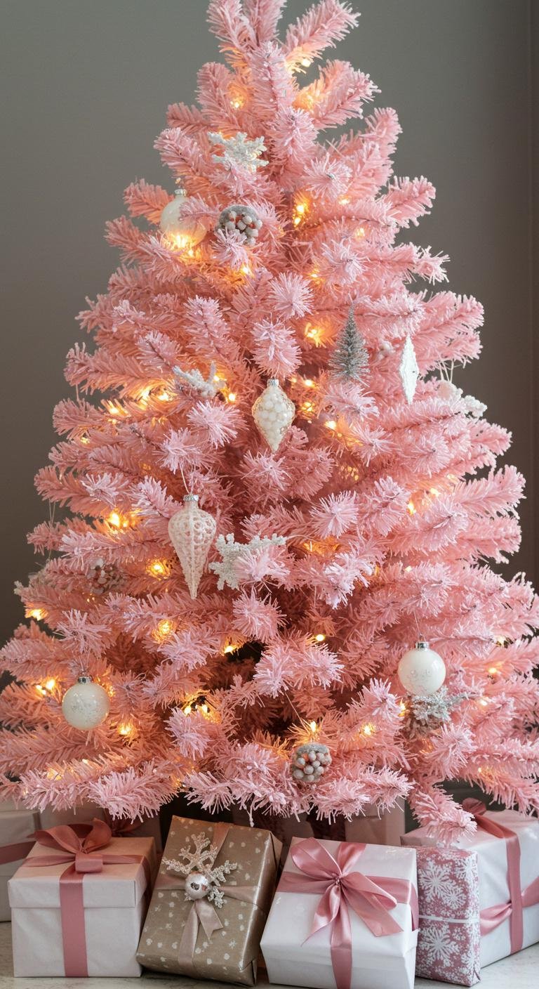 If you want a bit of that snowy magic but with a twist, flocked pink trees are the way to go. That soft, snow-dusted look adds charm and pairs beautifully with white or silver ornaments for a gentle, dreamy feel. Feeling crafty? Try spraying some artificial snow on a pink tree for a DIY version. Toss in some warm fairy lights, and you’ve created a cozy little holiday escape right in your living room. It’s like a winter wonderland, but make it pink.