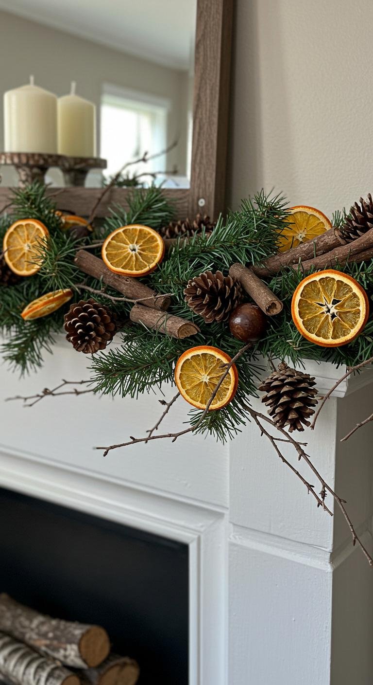 Nothing says cozy like a garland made from things you find outdoors. Dried citrus slices, cinnamon sticks, and pinecones tied onto twine or ribbon bring warm, earthy vibes that make your home feel so inviting.