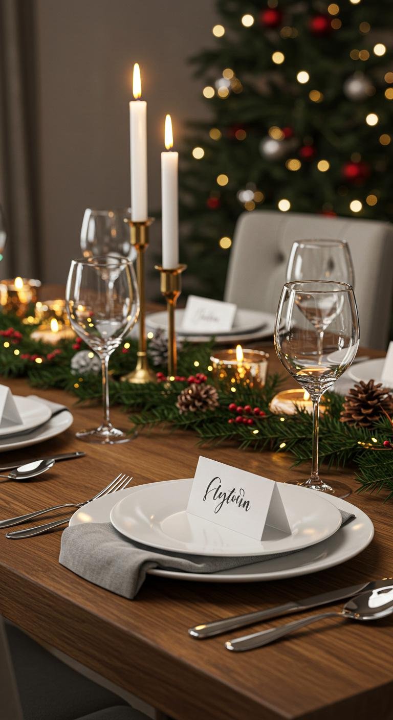 Create your own cards with decorative paper or craft supplies, and pair them with little tokens like tiny ornaments or trinkets at each place. Matching festive napkins and plates bring the whole look together, making everyone feel special and celebrated.
