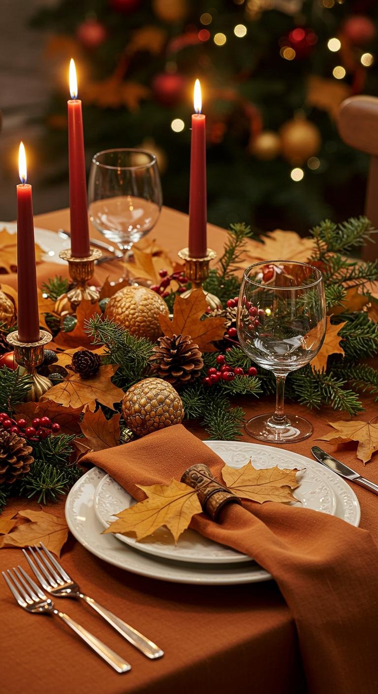 Try gathering leaves from the yard and placing them alongside pine sprigs in vases or centerpieces. It’s an easy, wallet-friendly way to capture both autumn and Christmas vibes without overload.