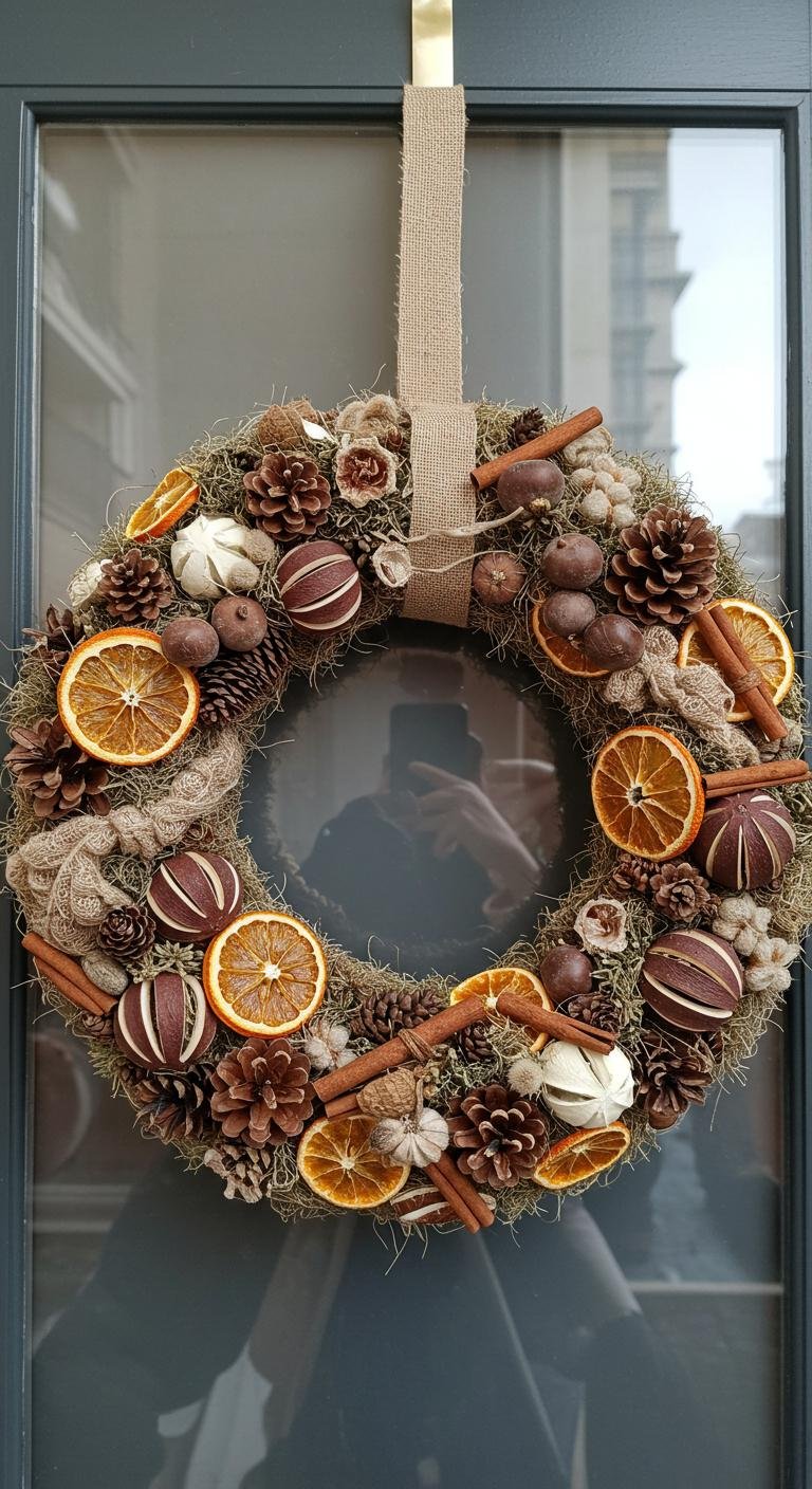 Handmade wreaths are always a win, especially when you get creative with materials like dried fruit slices, pinecones, and cinnamon sticks. The mix of textures really makes your door pop with personality.