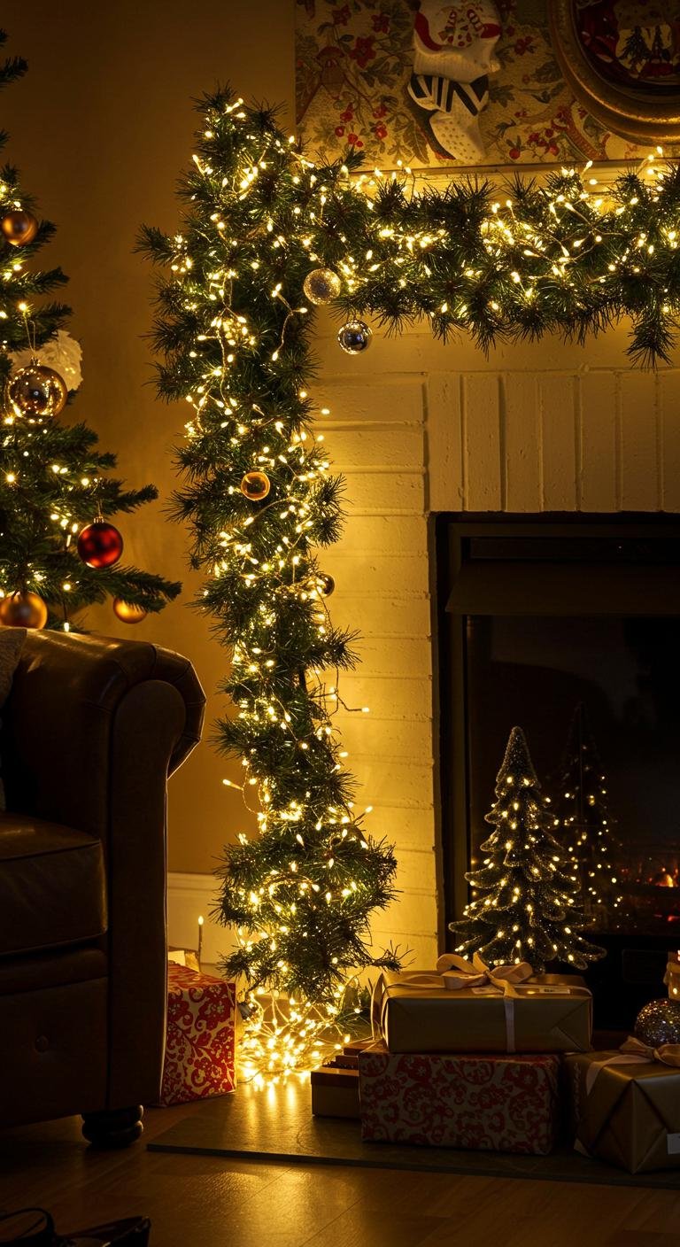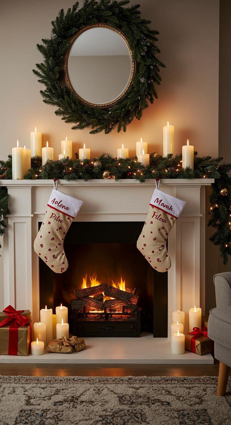 Don’t overlook your mantel as a prime spot for holiday charm. Layer garlands, candles, and personal touches like stockings or figurines for a cozy, inviting vibe. Try DIY garlands using dried oranges or popcorn strings for that homemade feel. It’s such a lovely canvas for spreading warmth in your home.