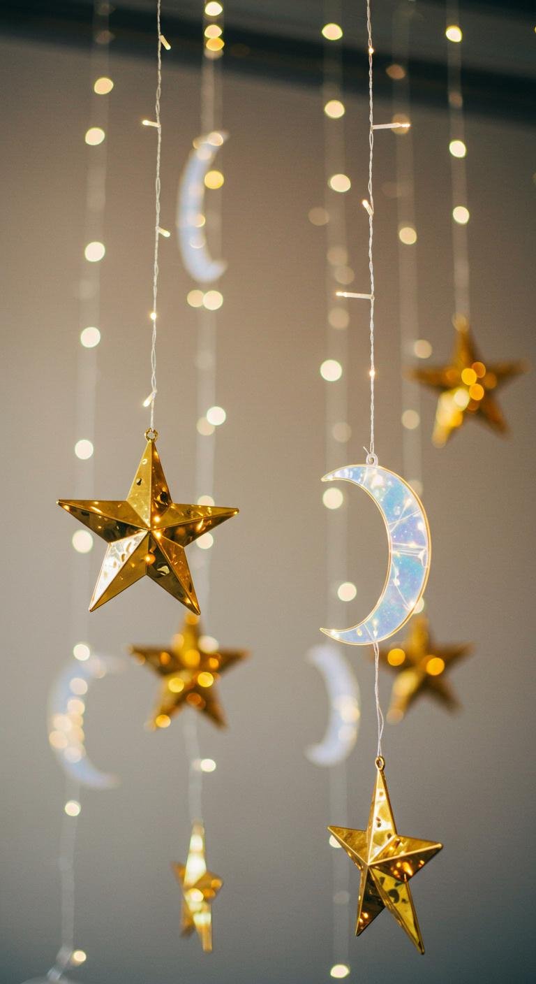 Stars and moons, anyone? Embracing a celestial theme adds this kind of magical, dream-like atmosphere—perfect for the holidays. You can hang star and moon ornaments throughout your tree or garlands. If you love DIY-ing, cut shapes from cardboard and paint them gleaming gold or silver. Toss in some string lights and watch your home glow with a little cosmic charm.