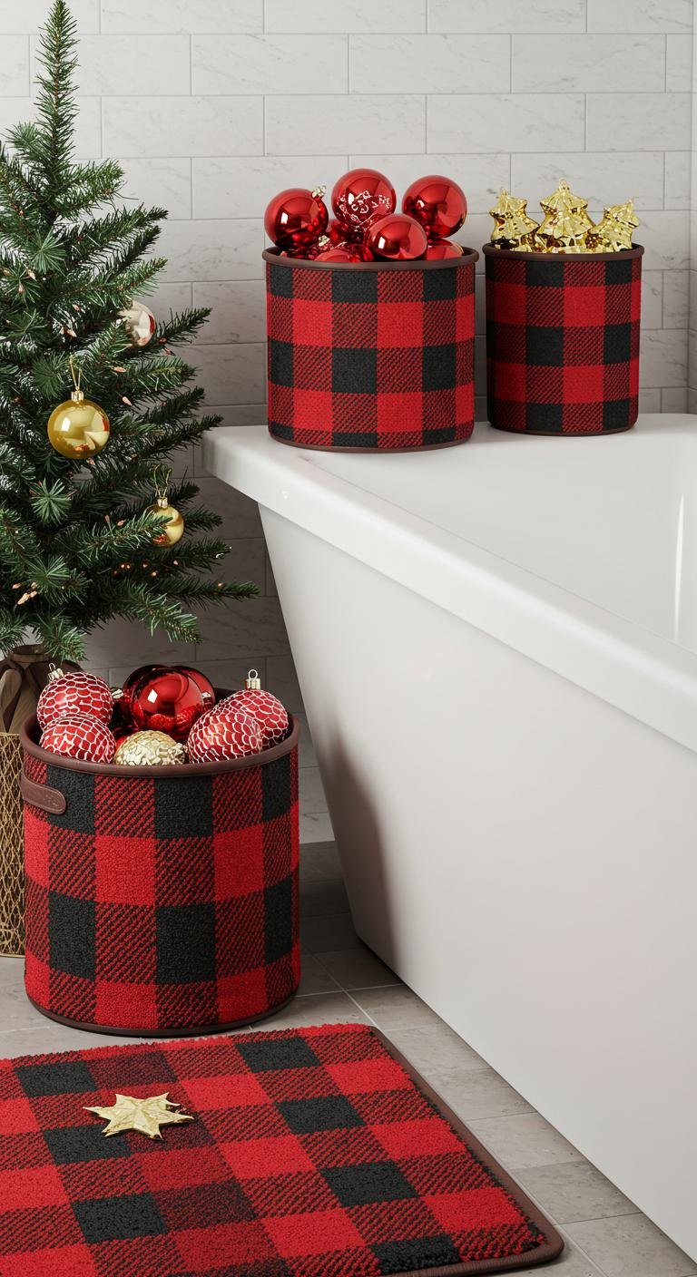 After enjoying a cozy bathroom adorned with plush plaid bath mats, your holiday decor journey can continue with the addition of decorative plaid containers for ornaments.