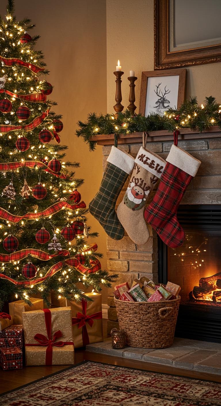 Hang rustic plaid stockings, rich in festive colors, to add that perfect touch of warmth and nostalgia.