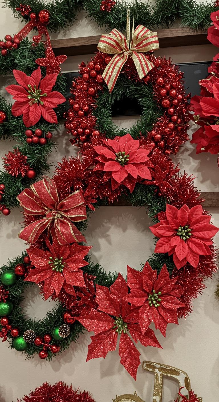Embrace stunning poinsettia wreath styles, combining rich reds and greens for a striking entrance.
