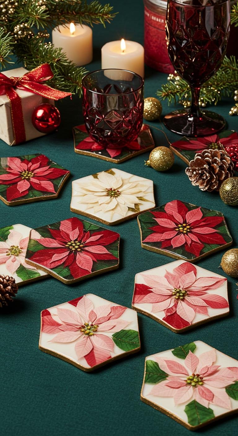 While you decorate for the holidays, think about incorporating poinsettia-inspired coasters into your festive table setting.