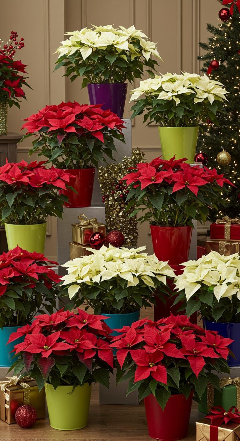 These stunning displays showcase bold poinsettia color combinations, blending red, white, and pink beautifully.