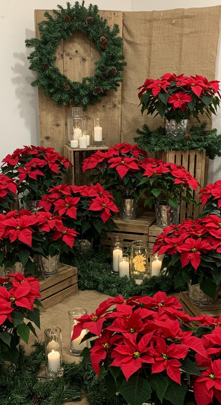 Use vibrant poinsettias against creative backdrop materials like burlap or wooden boards for a rustic charm.