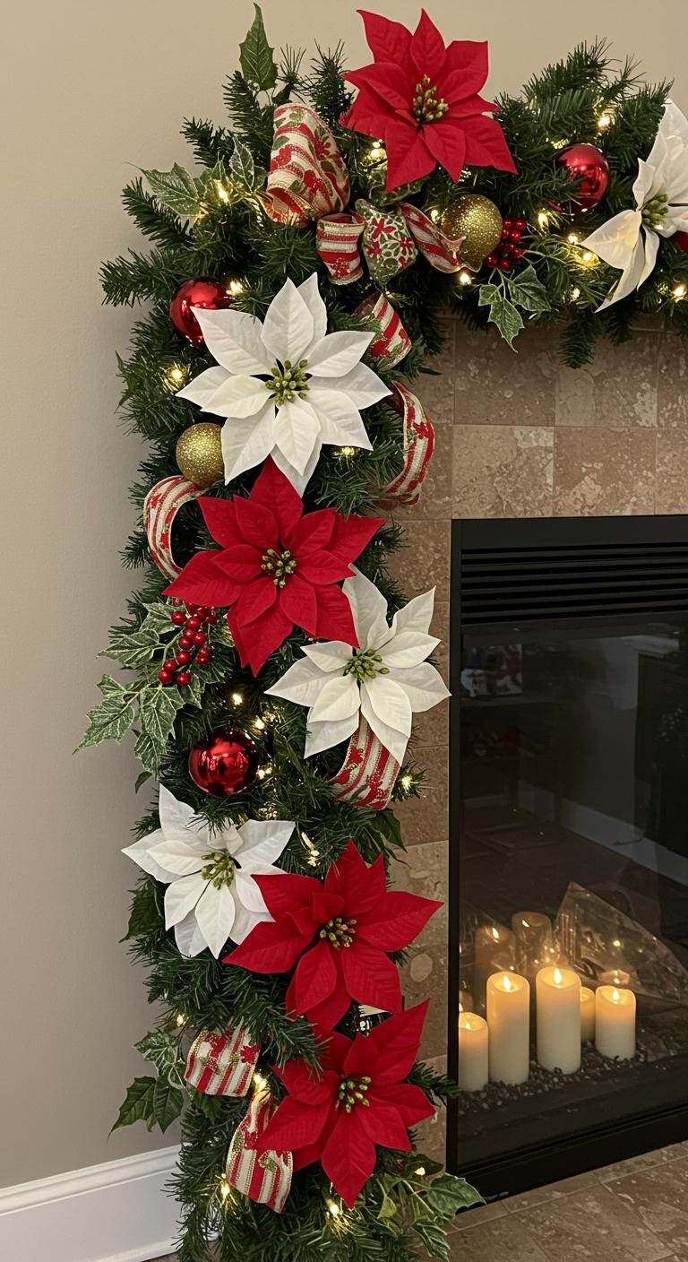 Transform your fireplace into a festive focal point by incorporating poinsettia accents that radiate holiday cheer.