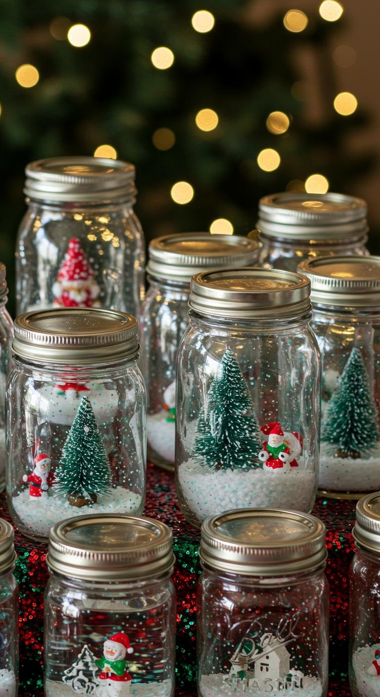 Mason jar snow globes are a fantastic way to embrace festive themes while showcasing unique mason jar uses. Simply fill your jar with water, glitter, and miniature decorations, then seal it tightly.