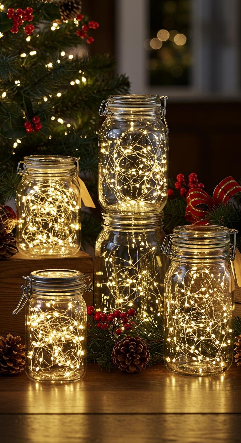 Glass jar fairy lights add a magical glow to your holiday decor, effortlessly combining charm and functionality.