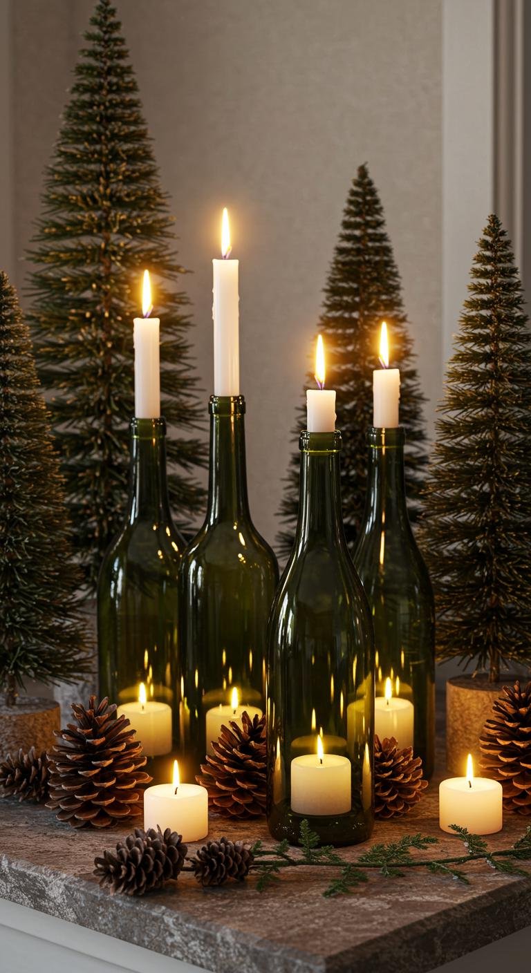 After crafting charming pinecone Christmas trees, you can elevate your holiday decor further with wine bottle candle holders. Wine bottle repurposing not only adds a rustic touch but also promotes sustainability. For candle holder crafting, simply clean the bottles, cut them if needed, and insert candles. This creative project brings warmth and eco-friendly cheer to your festivities while giving life to old bottles.