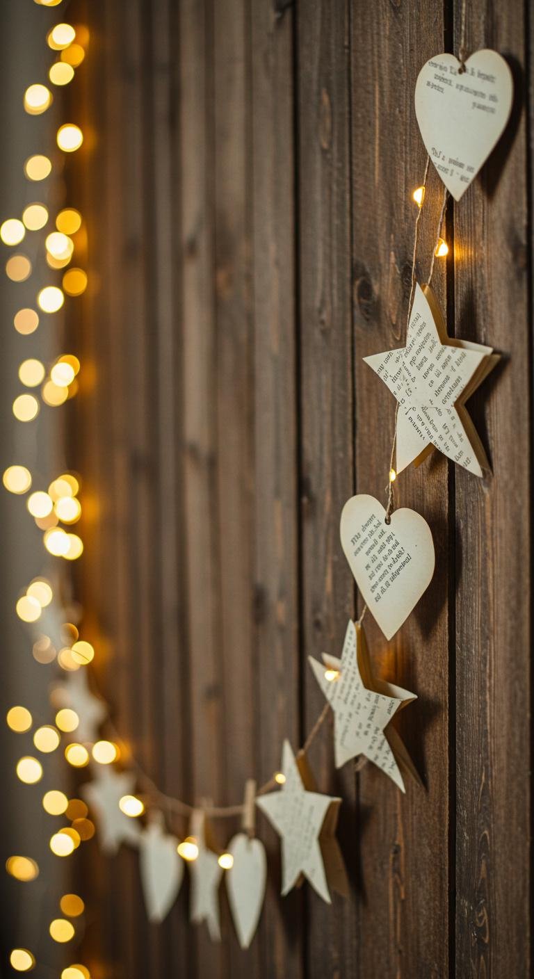 Creating old book page garlands not only brings a touch of vintage charm to your holiday decor but also gives new life to weathered pages that might otherwise go to waste. These delightful book page crafts are simple to make—just cut pages into shapes and string them together. Hang your garland, and enjoy the unique flair of vintage literature decor this festive season!