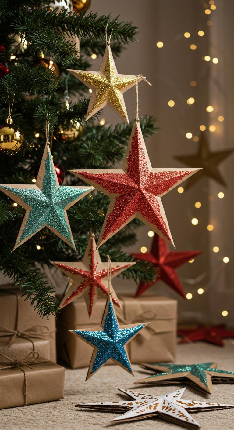 Immerse yourself in cardboard crafting by cutting and shaping various star forms, then decorate with paints or glitter for stunning star embellishments.