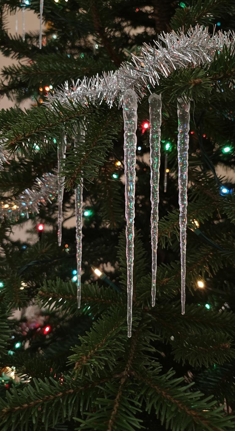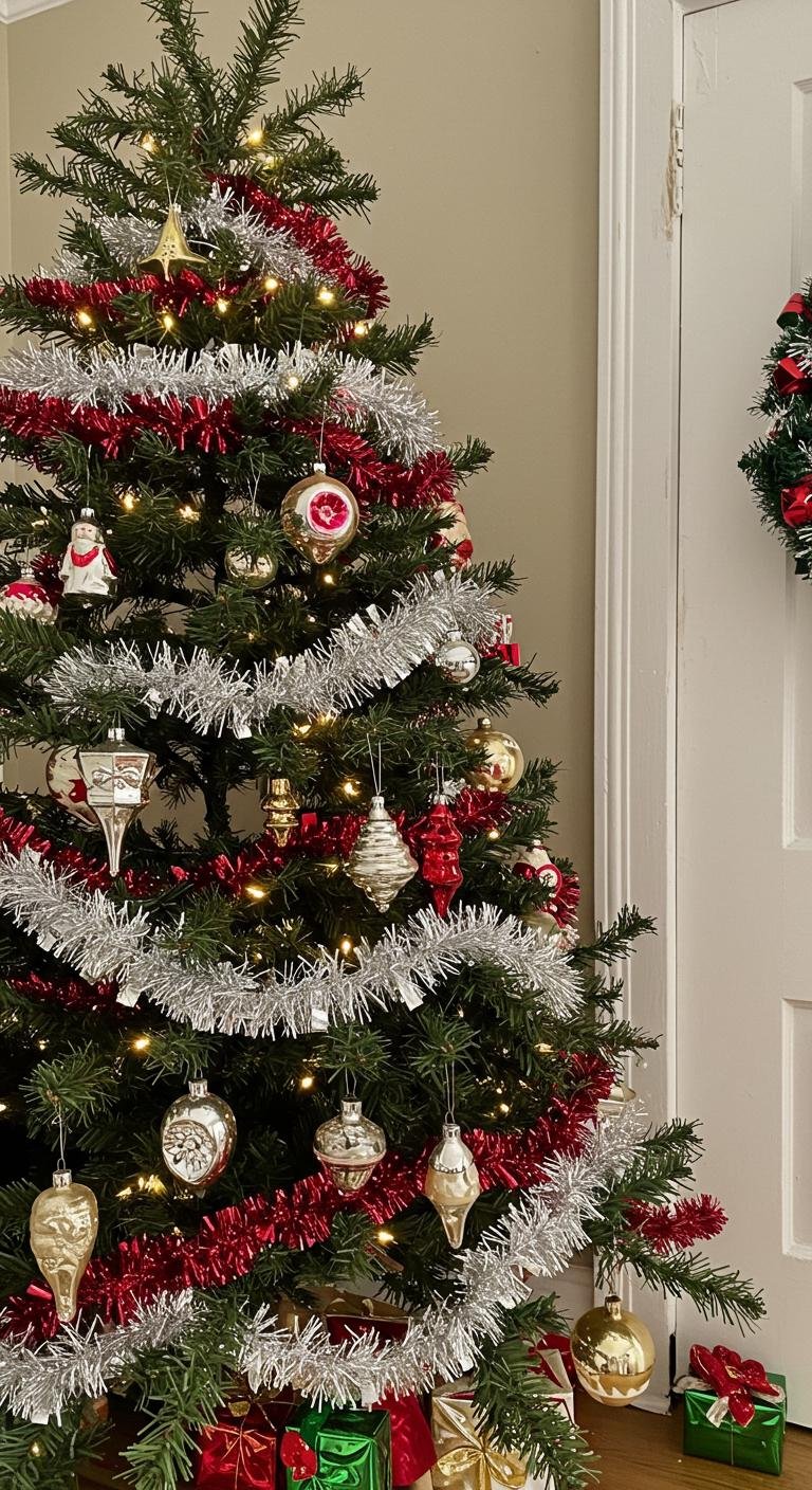 Tinsel icicles are like the fairy dust of vintage Christmas decor. Draping those shiny strands over your tree branches gives that cool, icy sparkle as if your tree is covered in real icicles. Plus, they’re super affordable and reusable, so just tuck them away carefully for next year. If you want to DIY, grab some reflective foil or metallic paper, cut them into long strips, and voilà—you’ve got shimmering icicles that make your tree twinkle every time you walk by.